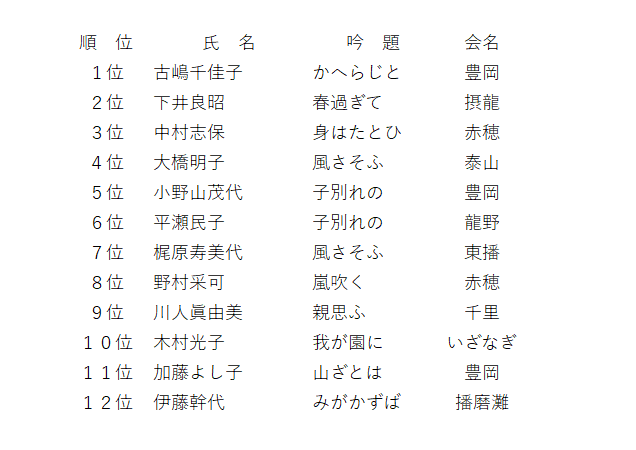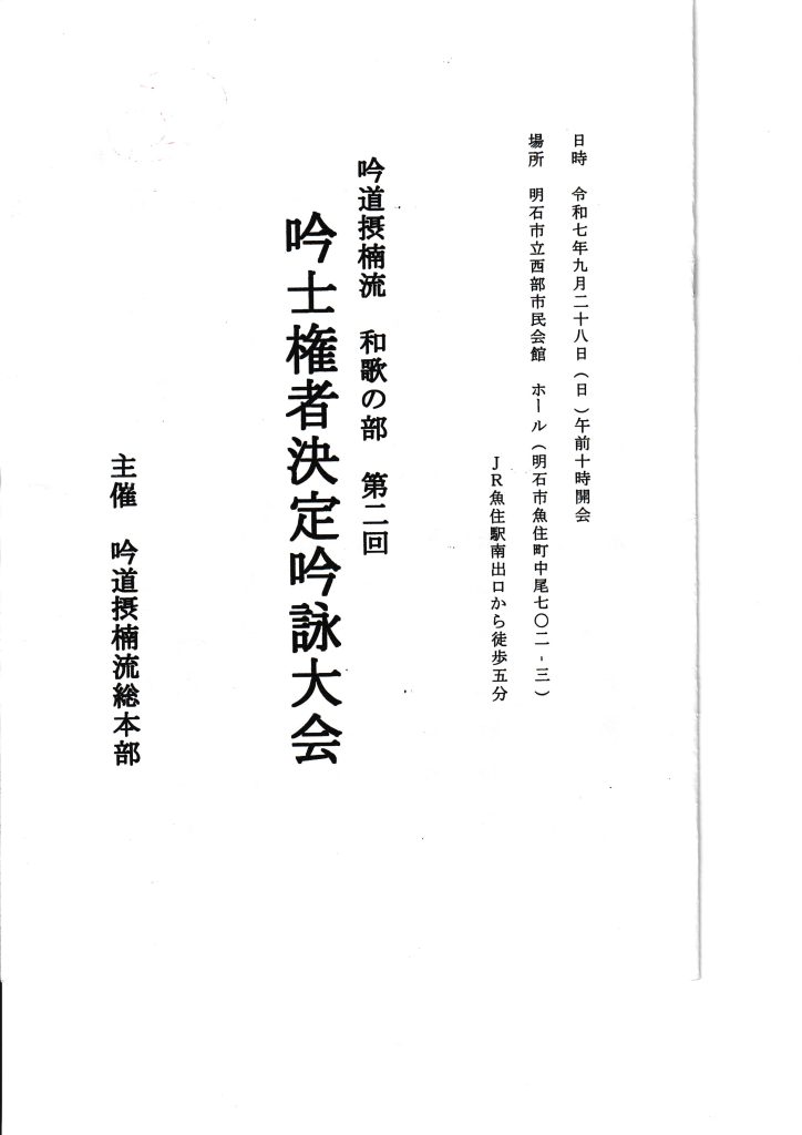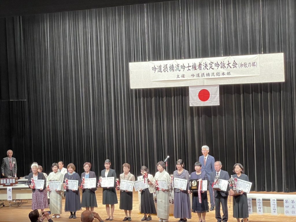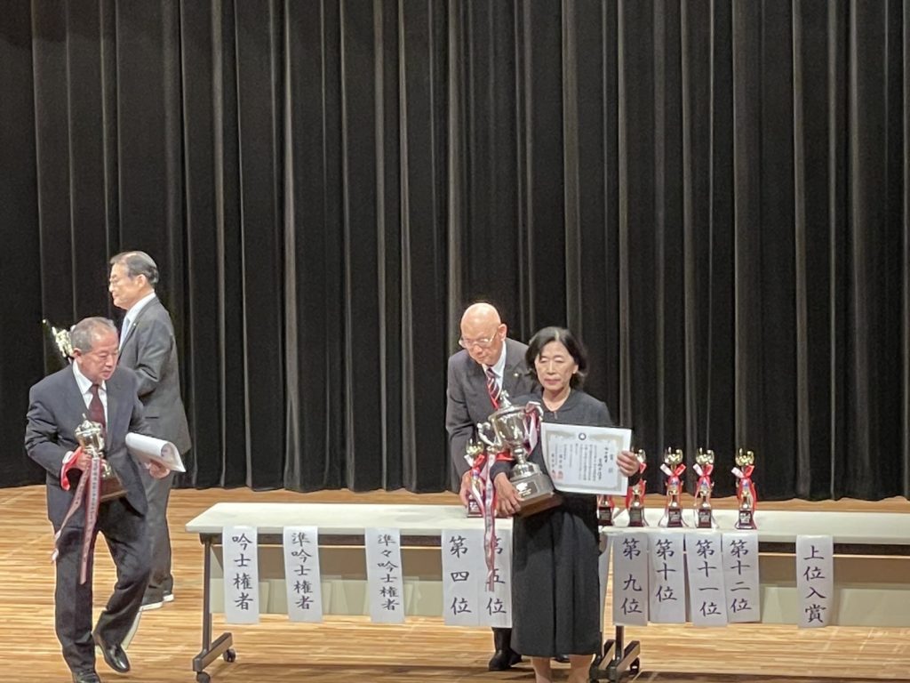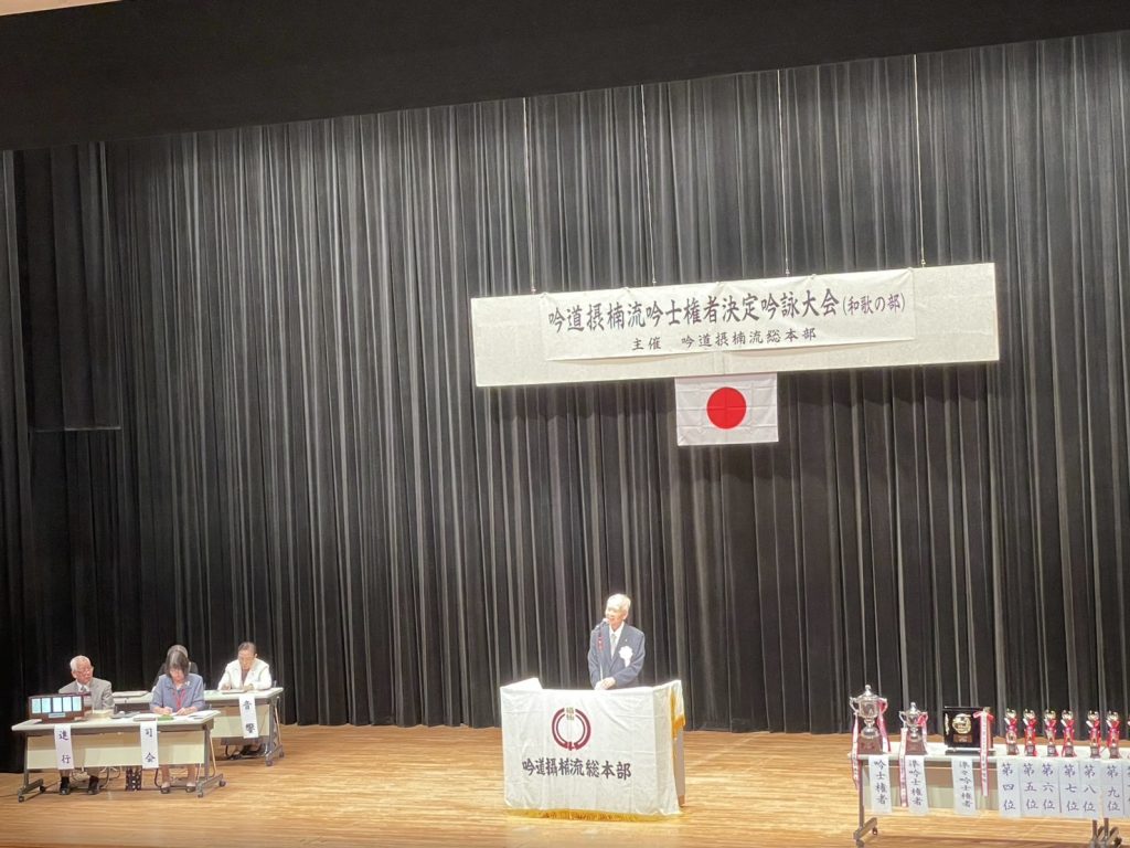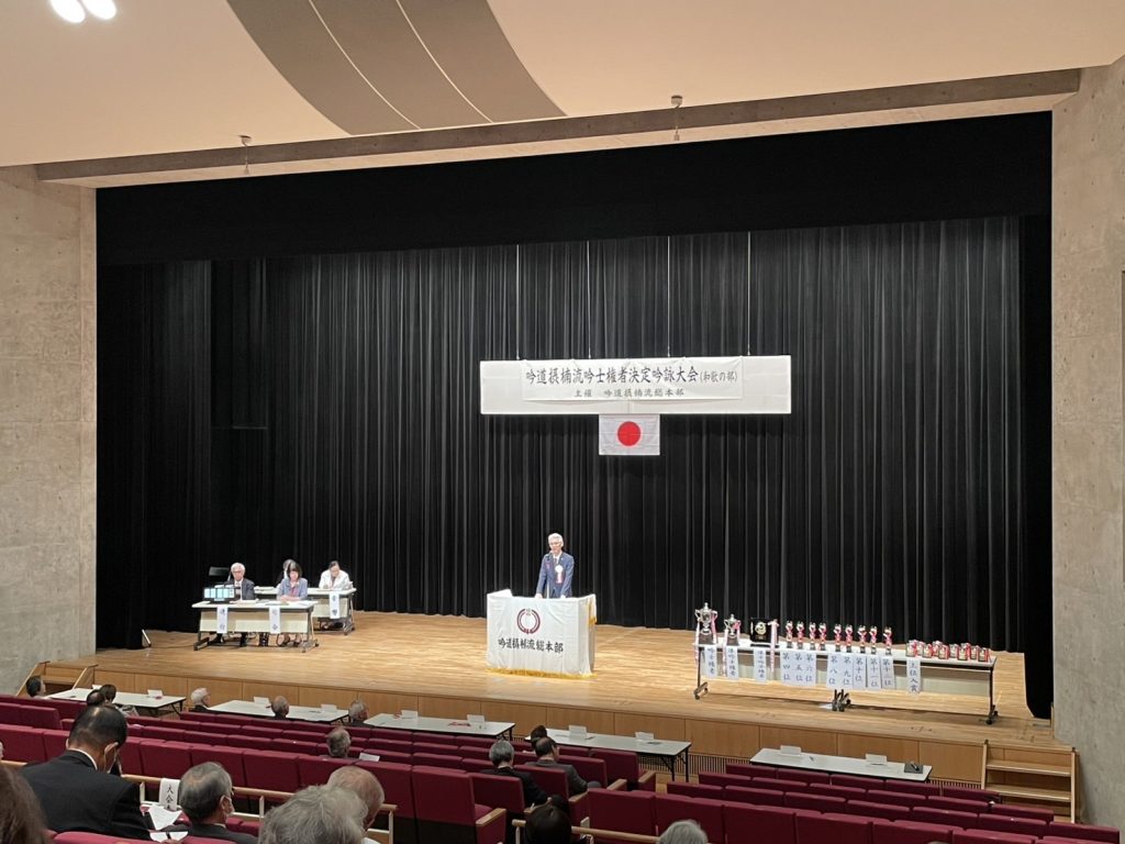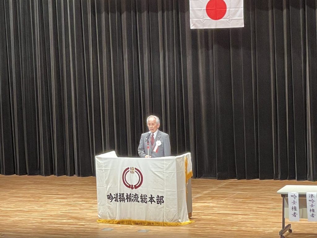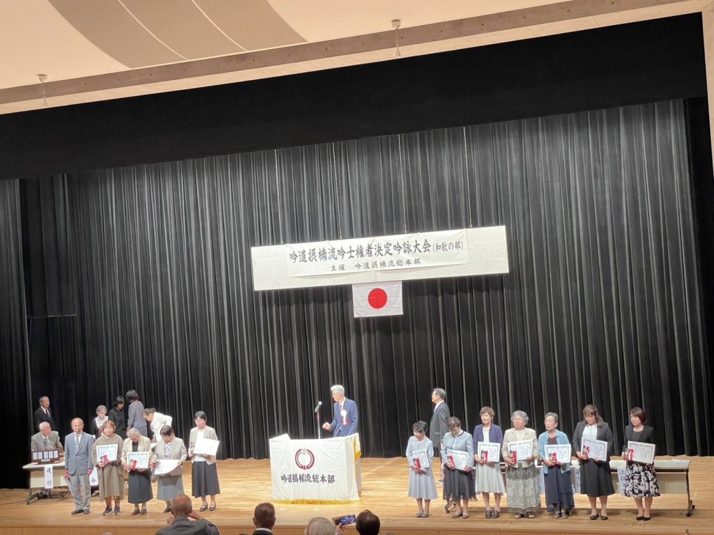 令和7年9月28日(日)明石市立西部市民会館ホールにて開催されました。 1組から4組 総勢139名が、日頃のお稽古の集大成を披露しました。 宗家の講評 第2回和歌の部の吟士権者は古嶋千佳子さん(豊岡)です。 おめでとうございます 上位入賞者の表彰 中川摂昇大会副委員長による万歳三唱