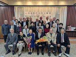 令和7年10月5日(日)に開催されました、兵庫県吟士権者決定吟詠大会(指導者の部)に於いて吟道摂楠流姫路地区連雅城吟詠会の北川摂達先生が吟士権者となられました。非常に名誉な事でありますので、姫路地区連会長、松尾摂修先生と幼少期より指導してこられました、田中摂洋先生をお招きして10月25日に北京閣で総勢28名の出席で盛大に行われました。北川摂達先生には、姫路地区連並びに雅城吟詠会を盛り上げていって頂きます様期待しています。